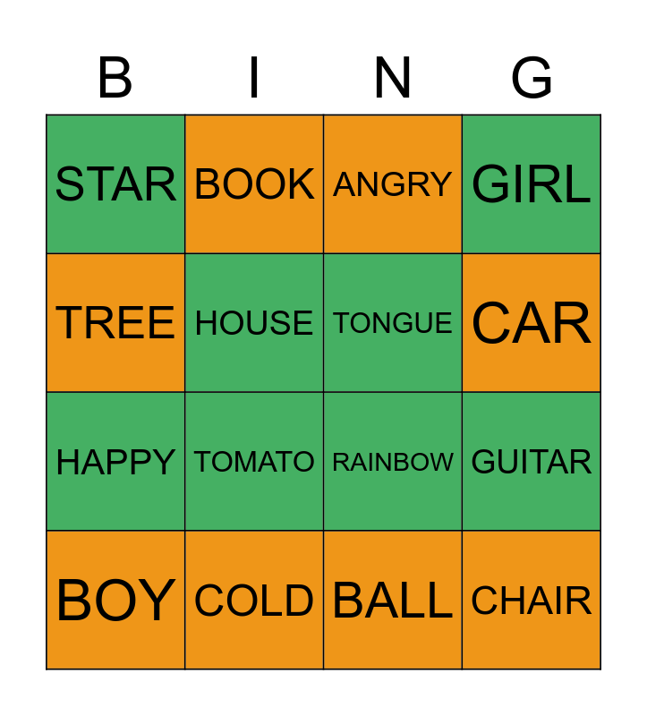 This bingo card has 16 words: COLD, GUITAR, ANGRY, STAR, HAPPY, BOOK, RAINBOW, BALL, TREE, HOUSE, BOY, GIRL, TOMATO, CAR, TONGUE and CHAIR.
