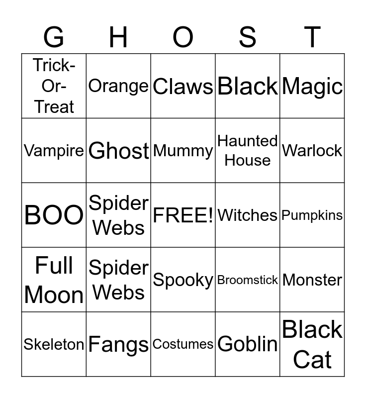 This bingo card has a free space and 24 words: Spider Webs, Fangs, Mummy, Skeleton, Magic, Trick-Or-Treat, Vampire, Orange, Witches, Spooky, Haunted House, BOO, Broomstick, Monster, Ghost, Goblin, Pumpkins, Claws, Warlock, Spider Webs, Black Cat, Full Moon, Black and Costumes.