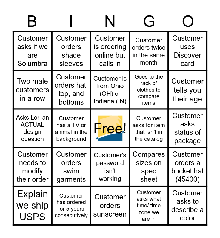 This bingo card has a free space and 24 words: Customer orders swim garments, Customer has ordered for 5 years consecutively, Customer is from Ohio (OH) or Indiana (IN), Explain we ship USPS, Customer uses Discover card, Customer asks if we are Solumbra, Two male customers in a row, Customer orders shade sleeves, Customer asks for item that isn't in the catalog, Customer's password isn't working, Goes to the rack of clothes to compare items, Asks Lori an ACTUAL design question, Compares sizes on spec sheet, Customer orders a bucket hat (45400), Customer orders hat, top, and bottoms, Customer asks what time/ time zone we are in, Customer asks status of package, Customer is ordering online but calls in, Customer tells you their age, Customer has a TV or animal in the background, Customer asks to describe a color, Customer needs to modify their order, Customer orders twice in the same month and Customer orders sunscreen.