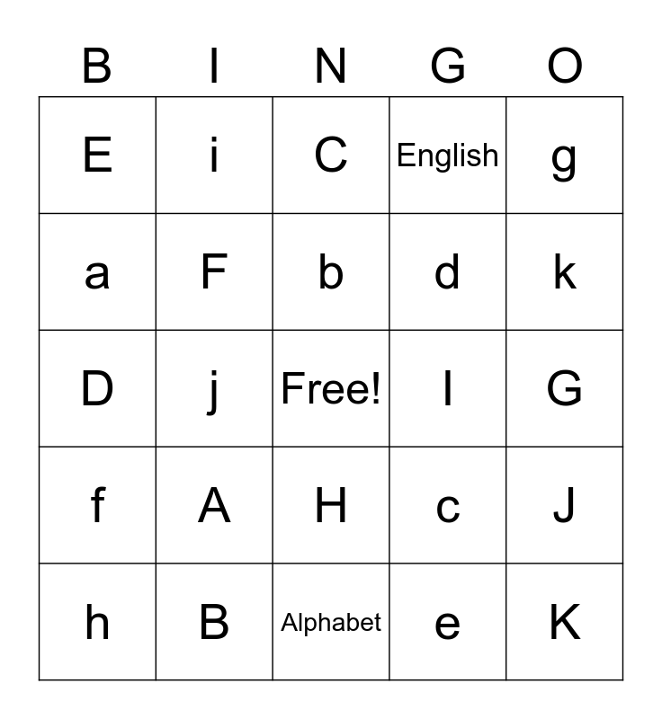 This bingo card has a free space and 24 words: A, B, b, h, g, E, a, i, I, H, d, D, c, J, F, e, G, C, k, j, K, f, English and Alphabet.