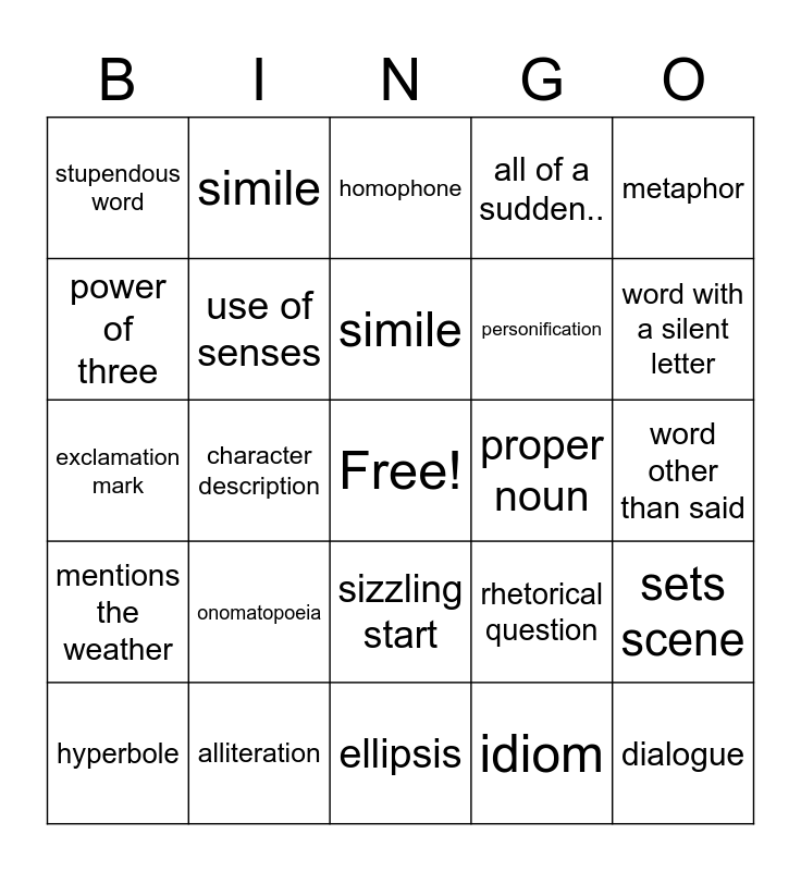 This bingo card has a free space and 24 words: onomatopoeia, alliteration, simile, hyperbole, metaphor, stupendous word, power of three, simile, proper noun, sizzling start, personification, exclamation mark, rhetorical question, sets scene, use of senses, idiom, word other than said, homophone, word with a silent letter, character description, dialogue, mentions the weather, all of a sudden.. and ellipsis.