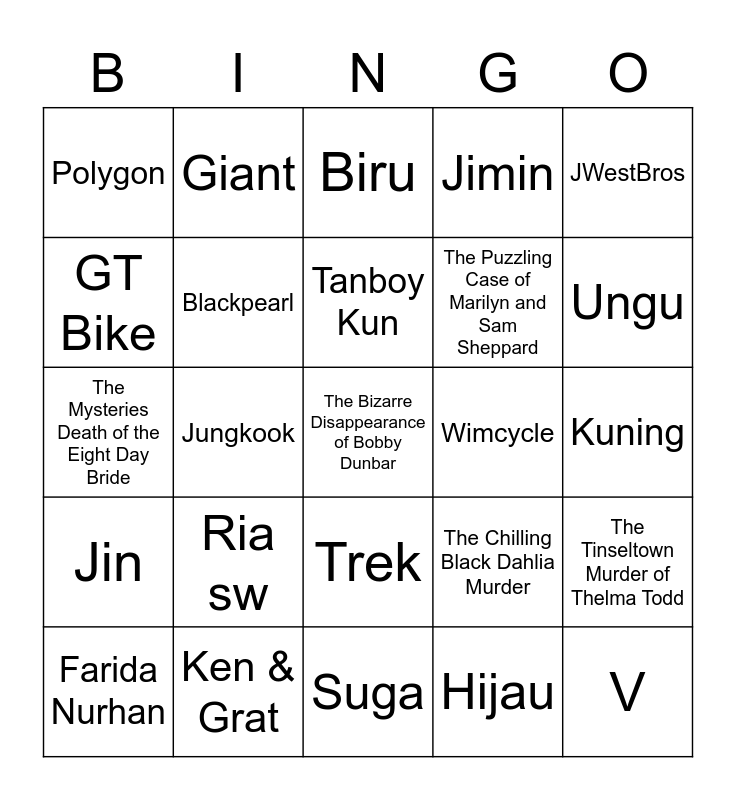 This bingo card has a free space and 24 words: Ria sw, Ken & Grat, Tanboy Kun, Farida Nurhan, JWestBros, Polygon, GT Bike, Giant, Wimcycle, Trek, The Puzzling Case of Marilyn and Sam Sheppard, The Mysteries Death of the Eight Day Bride, The Chilling Black Dahlia Murder, The Tinseltown Murder of Thelma Todd, Blackpearl, Hijau, Kuning, Biru, Ungu, Jungkook, V, Jin, Jimin and Suga.
