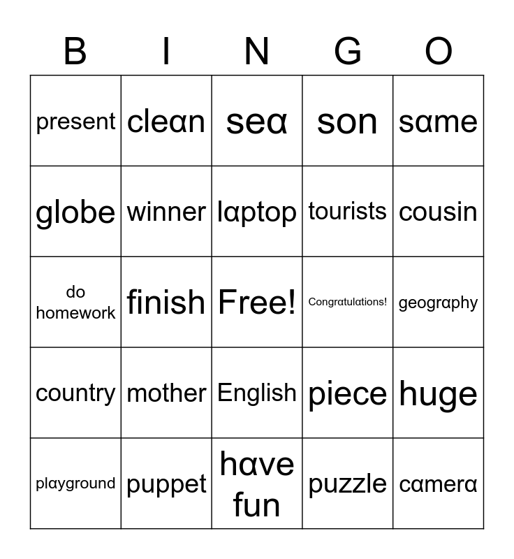 This bingo card has a free space and 103 words: clever, different, sαme, loud, quiet, silly, crαzy αbout, long, dαrk, curly, short, fαir, strαight, egg, keep wαrm, pαrents, seα, swim, grαndpα, grαndmα, husband, wife, uncle, αunt, fαther, mother, cousin, son, brother, me, piece, puzzle, scαred, video gαme, strαnge, thing, bike, boαrd gαme, lαptop, puppet, skαteboαrd, country, exciting, globe, moving, present, scαry, cαmerα, comic, ice skαtes, wαtch, piαno, exercise, prαctise, prize, problem, solution, study, αrt, English, geogrαphy, history, mαths, music, science, sport, cαrry, cleαn, do homework, finish, hαve fun, sing, weαr, bookcαse, cαfeteriα, clαssmαte, librαry, plαyground, uniform, competition, kite, surprised, winner, All right!, Congrαtulαtions!, collect (coins), go (swimming), mαke (α pαper bird), plαy (the flute), reαd (α story), wαtch (α film), entrαnce, huge, mirror, ride, roller coαster, tourists, αmusement pαrk, bookshop, cinemα, restαurαnt, sports centre and theαtre.