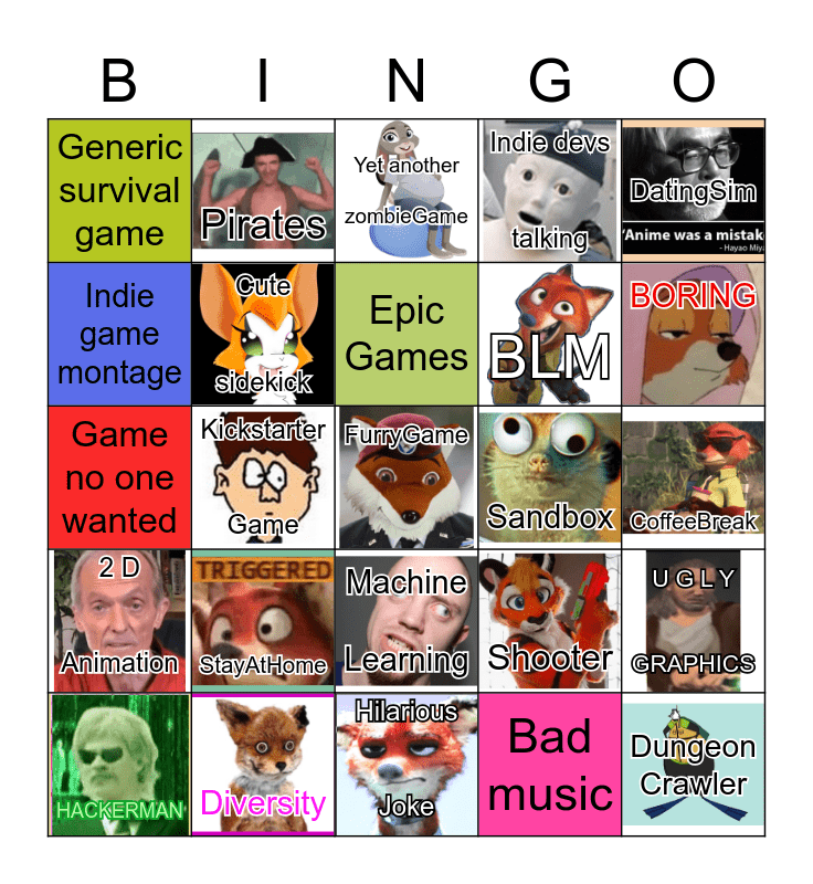 This bingo card has 20 images and 25 words: StayAtHome, Hilarious Joke, Epic Games, HACKERMAN, DatingSim, Generic survival game, Indie game montage, Pirates, Sandbox, Machine Learning, BLM, Game no one wanted, Shooter, U G L Y GRAPHICS, Cute sidekick, Dungeon Crawler, CoffeeBreak, Yet another zombieGame, BORING, Kickstarter Game, FurryGame, Diversity, 2 D Animation, Indie devs talking and Bad music.