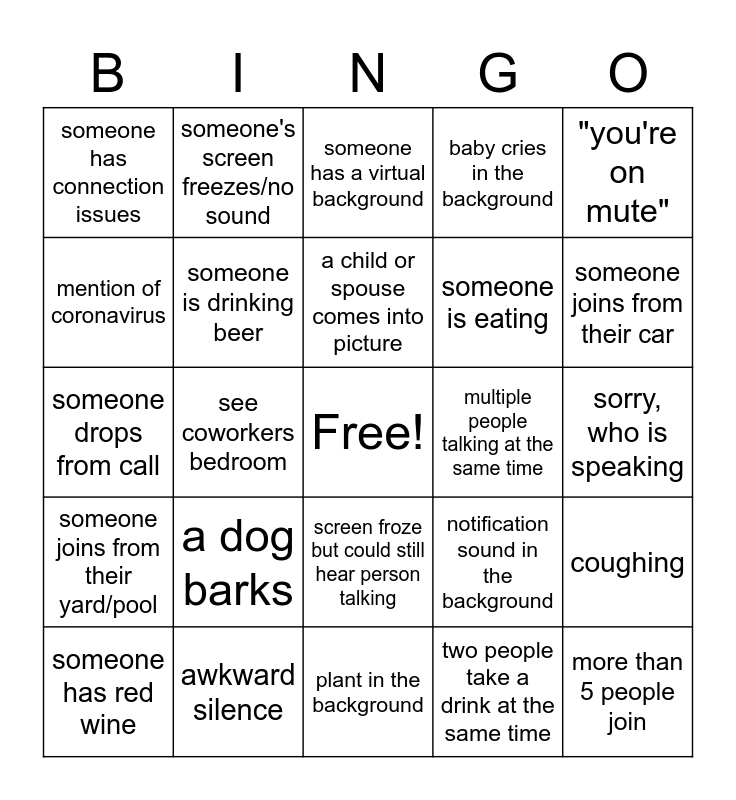 This bingo card has a free space and 24 words: someone has red wine, a dog barks, a child or spouse comes into picture, two people take a drink at the same time, "you're on mute", someone has connection issues, someone's screen freezes/no sound, someone has a virtual background, multiple people talking at the same time, sorry, who is speaking, someone drops from call, someone is drinking beer, notification sound in the background, coughing, mention of coronavirus, awkward silence, plant in the background, baby cries in the background, someone joins from their car, someone joins from their yard/pool, see coworkers bedroom, screen froze but could still hear person talking, someone is eating and more than 5 people join.