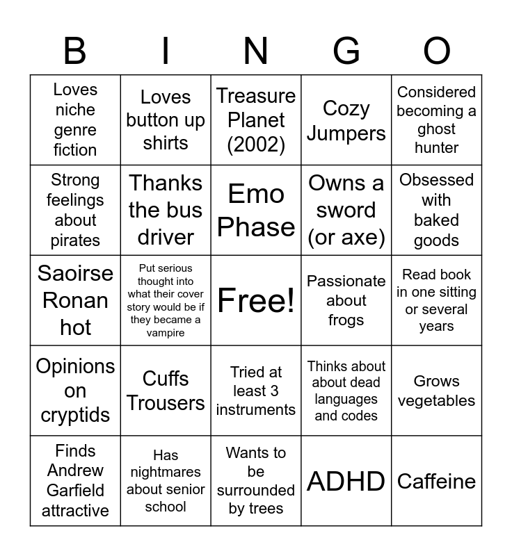 This bingo card has a free space and 24 words: Cuffs Trousers, Has nightmares about senior school, Emo Phase, Finds Andrew Garfield attractive, Considered becoming a ghost hunter, Loves niche genre fiction, Strong feelings about pirates, Loves button up shirts, Passionate about frogs, Tried at least 3 instruments, Owns a sword (or axe), Saoirse Ronan hot, Thinks about about dead languages and codes, Grows vegetables, Thanks the bus driver, ADHD, Read book in one sitting or several years, Treasure Planet (2002), Obsessed with baked goods, Put serious thought into what their cover story would be if they became a vampire, Caffeine, Opinions on cryptids, Cozy Jumpers and Wants to be surrounded by trees.