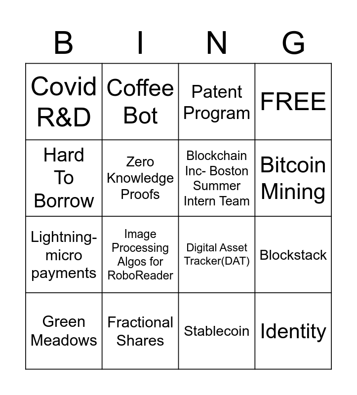 This bingo card has 16 words: Green Meadows, Fractional Shares, Patent Program, FREE, Hard To Borrow, Coffee Bot, Digital Asset Tracker(DAT), Blockstack, Covid R&D, Zero Knowledge Proofs, Stablecoin, Bitcoin Mining, Lightning-micro payments, Image Processing Algos for RoboReader, Blockchain Inc- Boston Summer Intern Team and Identity.