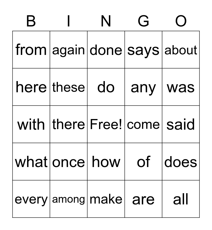 This bingo card has a free space and 25 words: once, make, do, every, about, from, here, again, come, how, any, with, of, does, these, where, said, done, was, there, all, among, what, says and are.