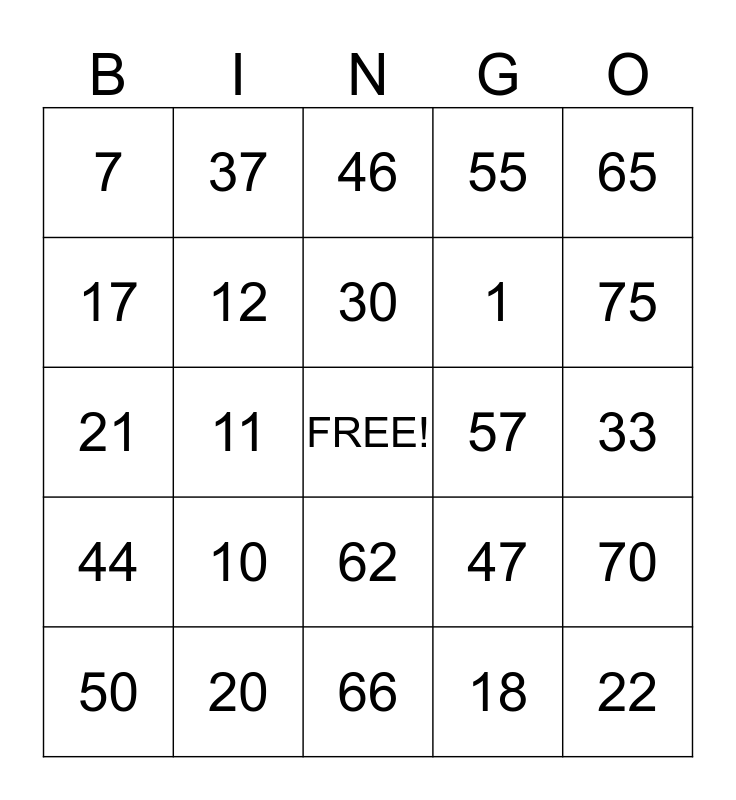 This bingo card has a free space and 24 words: 10, 20, 30, 50, 65, 7, 17, 37, 57, 62, 1, 21, 47, 70, 12, 18, 33, 46, 75, 11, 22, 44, 55 and 66.