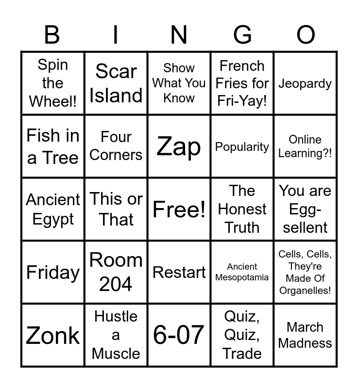 This bingo card has a free space and 24 words: Room 204, Hustle a Muscle, Zap, Zonk, Jeopardy, Spin the Wheel!, Fish in a Tree, Scar Island, The Honest Truth, Restart, Popularity, Ancient Egypt, Ancient Mesopotamia, Cells, Cells, They're Made Of Organelles!, Four Corners, Quiz, Quiz, Trade, You are Egg-sellent, Show What You Know, Online Learning?!, This or That, March Madness, Friday, French Fries for Fri-Yay! and 6-07.
