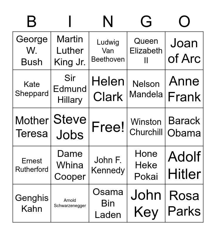 This bingo card has a free space and 24 words: Dame Whina Cooper, Arnold Schwarzenegger, Helen Clark, Genghis Kahn, Joan of Arc, George W. Bush, Kate Sheppard, Martin Luther King Jr., Winston Churchill, John F. Kennedy, Nelson Mandela, Mother Teresa, Hone Heke Pokai, Adolf Hitler, Sir Edmund Hillary, John Key, Barack Obama, Ludwig Van Beethoven, Anne Frank, Steve Jobs, Rosa Parks, Ernest Rutherford, Queen Elizabeth II and Osama Bin Laden.