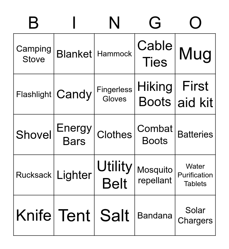 This bingo card has 51 words: Free!, Backpack, Bandage, Bandana, Batteries, Binoculars, Blanket, Bucket Hat, Cable Ties, Camp Axe, Camping Stove, Candy, Clothes, Combat Boots, Compass, Crowbar, Energy Bars, Fingerless Gloves, Fire starter, First aid kit, Flashlight, Gun holster, Hammock, Hiking Boots, Instant food, Knife, Lighter, Map, Mosquito repellant, Mug, Paracord, Pepper Spray, Radio, Rain Jacket/Coat, Rope, Rucksack, Safari Jacket, Salt, Scissors, Sewing Kit, Shovel, Signal Mirror, Sleeping Bag, Socks, Solar Chargers, Sunglasses, Tent, Utility Belt, Water bottle, Water Purification Tablets and Whistle.
