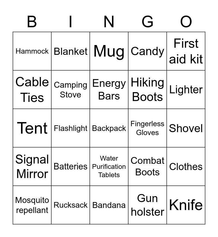 This bingo card has 51 words: Free!, Backpack, Bandage, Bandana, Batteries, Binoculars, Blanket, Bucket Hat, Cable Ties, Camp Axe, Camping Stove, Candy, Clothes, Combat Boots, Compass, Crowbar, Energy Bars, Fingerless Gloves, Fire starter, First aid kit, Flashlight, Gun holster, Hammock, Hiking Boots, Instant food, Knife, Lighter, Map, Mosquito repellant, Mug, Paracord, Pepper Spray, Radio, Rain Jacket/Coat, Rope, Rucksack, Safari Jacket, Salt, Scissors, Sewing Kit, Shovel, Signal Mirror, Sleeping Bag, Socks, Solar Chargers, Sunglasses, Tent, Utility Belt, Water bottle, Water Purification Tablets and Whistle.