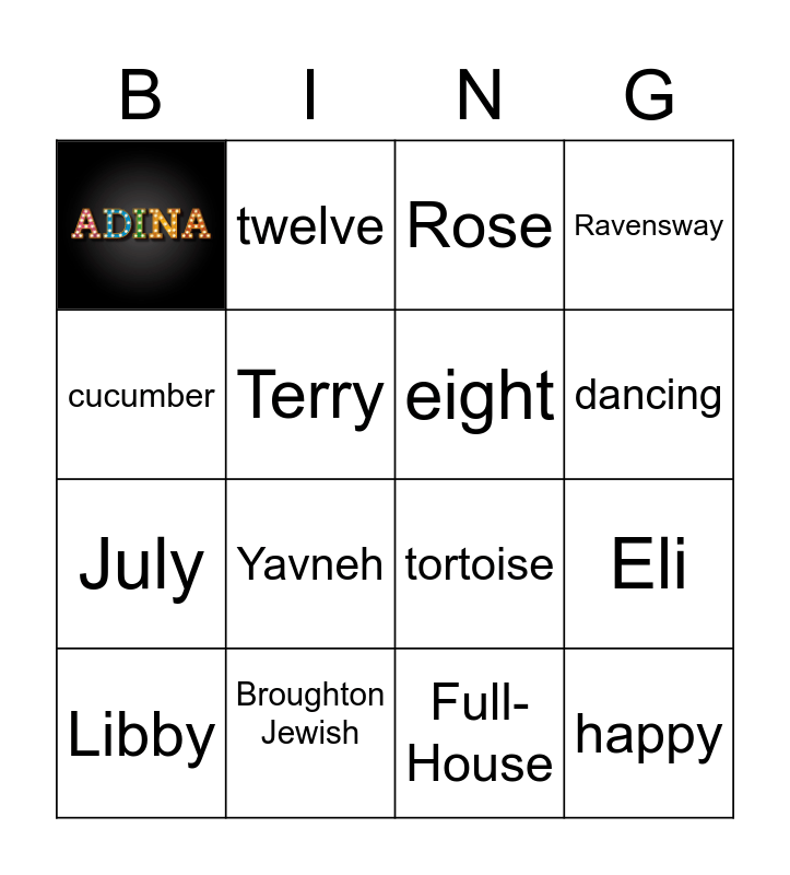 This bingo card has 1 images and 17 words: cucumber, Broughton Jewish, Rose, Ravensway, July, twelve, tortoise, dancing, Yavneh, Full-House, Eli, Libby, Terry, eight, happy, exciteable and blanket.