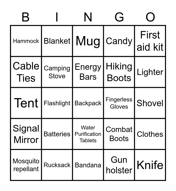 This bingo card has 51 words: Free!, Backpack, Bandage, Bandana, Batteries, Binoculars, Blanket, Bucket Hat, Cable Ties, Camp Axe, Camping Stove, Candy, Clothes, Combat Boots, Compass, Crowbar, Energy Bars, Fingerless Gloves, Fire starter, First aid kit, Flashlight, Gun holster, Hammock, Hiking Boots, Instant food, Knife, Lighter, Map, Mosquito repellant, Mug, Paracord, Pepper Spray, Radio, Rain Jacket/Coat, Rope, Rucksack, Safari Jacket, Salt, Scissors, Sewing Kit, Shovel, Signal Mirror, Sleeping Bag, Socks, Solar Chargers, Sunglasses, Tent, Utility Belt, Water bottle, Water Purification Tablets and Whistle.