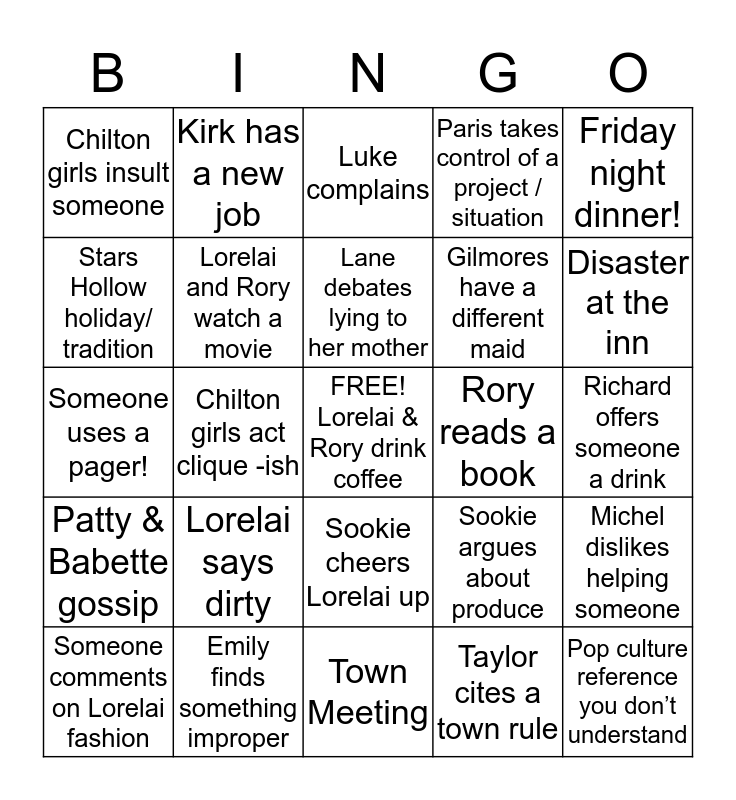 This bingo card has a free space and 24 words: Lorelai says dirty, Emily finds something improper, Lane debates lying to her mother, Someone comments on Lorelai fashion, Friday night dinner!, Chilton girls insult someone, Stars Hollow holiday/ tradition, Kirk has a new job, Rory reads a book, Sookie cheers Lorelai up, Gilmores have a different maid, Someone uses a pager!, Sookie argues about produce, Michel dislikes helping someone, Lorelai and Rory watch a movie, Taylor cites a town rule, Richard offers someone a drink, Luke complains, Disaster at the inn, Chilton girls act clique -ish, Pop culture reference you don’t understand, Patty & Babette gossip, Paris takes control of a project / situation and Town Meeting.