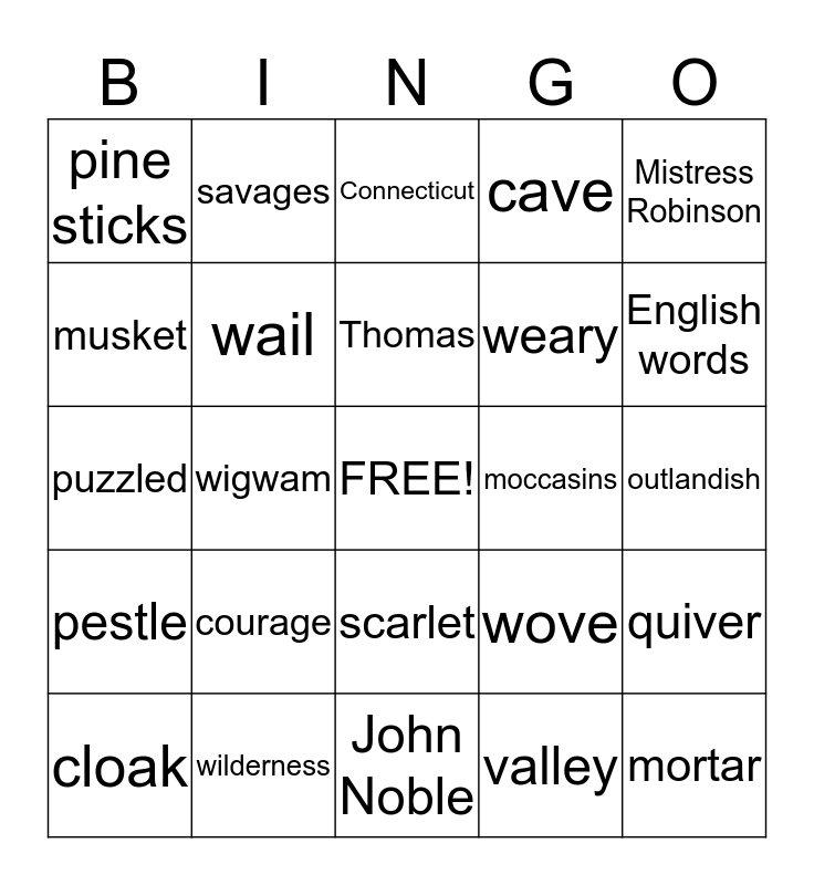This bingo card has a free space and 24 words: courage, wilderness, Thomas, cloak, Mistress Robinson, pine sticks, musket, savages, moccasins, scarlet, weary, puzzled, wove, quiver, wail, valley, outlandish, Connecticut, English words, wigwam, mortar, pestle, cave and John Noble.
