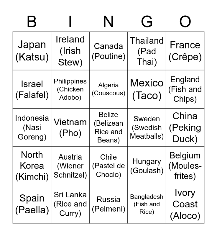 This bingo card has 42 words: Afghanistan (Kabuli Pulao), Algeria (Couscous), Australia (Meat Pie), Austria (Wiener Schnitzel), Bangladesh (Fish and Rice), Belgium (Moules-frites), Belize (Belizean Rice and Beans), Brazil (Feijoada), Canada (Poutine), Chile (Pastel de Choclo), China (Peking Duck), England (Fish and Chips), Vietnam (Pho), France (Crêpe), Greece (Moussaka), Hungary (Goulash), India (Tandoori Chicken), Indonesia (Nasi Goreng), Iran (Chelo Kebab), Ireland (Irish Stew), Israel (Falafel), Italy (Pizza), Ivory Coast (Aloco), Japan (Katsu), Latvia (Grey Peas, Bacon, and Onion), Lebanon (Kibbeh), Mexico (Taco), Mauritius (Dholl Puri), Morocco (Tagine), Netherlands (Stamppot), New Zealand (Pavlova), North Korea (Kimchi), Philippines (Chicken Adobo), Russia (Pelmeni), Scotland (Haggis), Spain (Paella), Sri Lanka (Rice and Curry), Sweden (Swedish Meatballs), Switzerland (Rösti), Taiwan (Beef Noodle Soup), Thailand (Pad Thai) and Ukraine (Borscht).