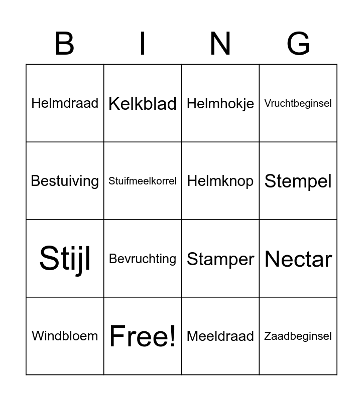 This bingo card has 21 words: Free!, Kroonblad, Kelkblad, Bloemsteel, Meeldraad, Helmknop, Helmdraad, Helmhokje, Stamper, Stempel, Stijl, Vruchtbeginsel, Zaadbeginsel, Eicel, Stuifmeelkorrel, Insectenbloem, Windbloem, Bevruchting, Bestuiving, Nectar and Stuifmeelbuis.