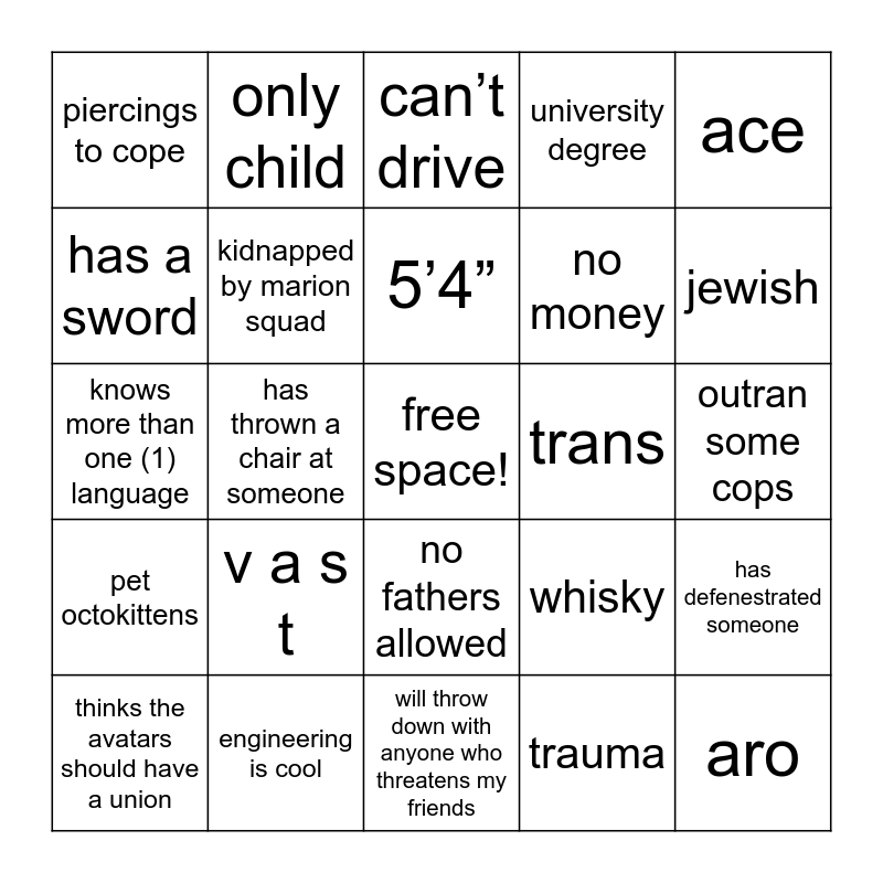 This bingo card has a free space and 24 words: v a s t, engineering is cool, 5’4”, thinks the avatars should have a union, ace, piercings to cope, has a sword, only child, trans, no fathers allowed, no money, knows more than one (1) language, whisky, has defenestrated someone, kidnapped by marion squad, trauma, outran some cops, can’t drive, jewish, has thrown a chair at someone, aro, pet octokittens, university degree and will throw down with anyone who threatens my friends.