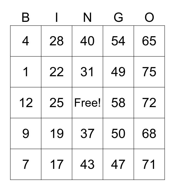 This bingo card has a free space and 24 words: 7, 19, 31, 47, 65, 4, 28, 40, 58, 72, 12, 22, 50, 68, 1, 17, 43, 54, 75, 9, 25, 37, 49 and 71.