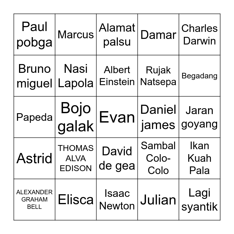 This bingo card has 25 words: THOMAS ALVA EDISON, Isaac Newton, Albert Einstein, ALEXANDER GRAHAM BELL, Charles Darwin, Paul pobga, Bruno miguel, Marcus, Daniel james, David de gea, Rujak Natsepa, Papeda, Sambal Colo-Colo, Ikan Kuah Pala, Nasi Lapola, Lagi syantik, Jaran goyang, Alamat palsu, Begadang, Bojo galak, Evan, Elisca, Astrid, Damar and Julian.