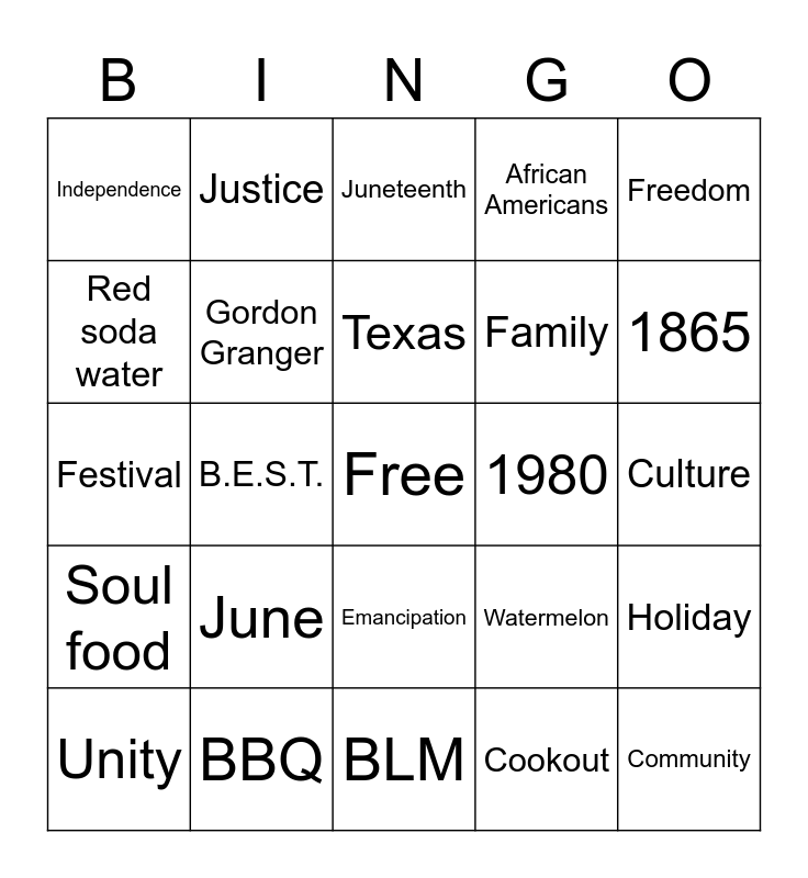 This bingo card has a free space and 24 words: June, BBQ, Texas, Unity, Freedom, Independence, Red soda water, Justice, 1980, Emancipation, Family, Festival, Watermelon, Holiday, Gordon Granger, Cookout, Culture, Juneteenth, 1865, B.E.S.T., Community, Soul food, African Americans and BLM.