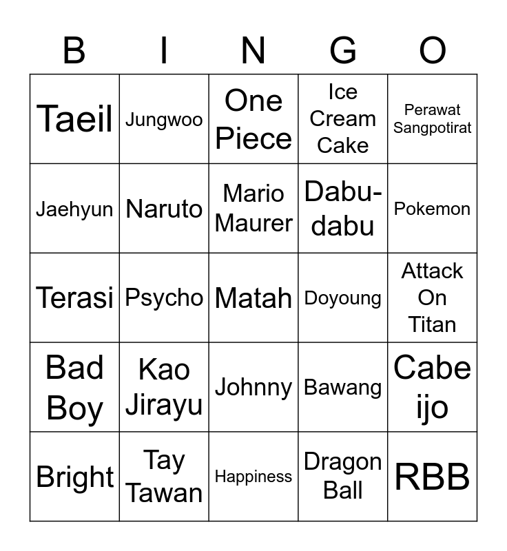 This bingo card has a free space and 24 words: Kao Jirayu, Tay Tawan, Mario Maurer, Bright, Perawat Sangpotirat, Taeil, Jaehyun, Jungwoo, Doyoung, Johnny, Dabu-dabu, Terasi, Bawang, Cabe ijo, Naruto, Dragon Ball, Attack On Titan, One Piece, Pokemon, Psycho, RBB, Bad Boy, Ice Cream Cake and Happiness.