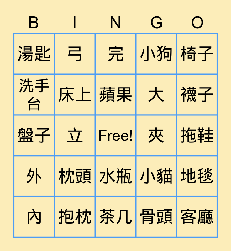 This bingo card has a free space and 24 words: 內, 枕頭, 蘋果, 骨頭, 椅子, 湯匙, 弓, 完, 夾, 拖鞋, 盤子, 床上, 小貓, 地毯, 洗手台, 抱枕, 茶几, 小狗, 襪子, 外, 立, 水瓶, 大 and 客廳.