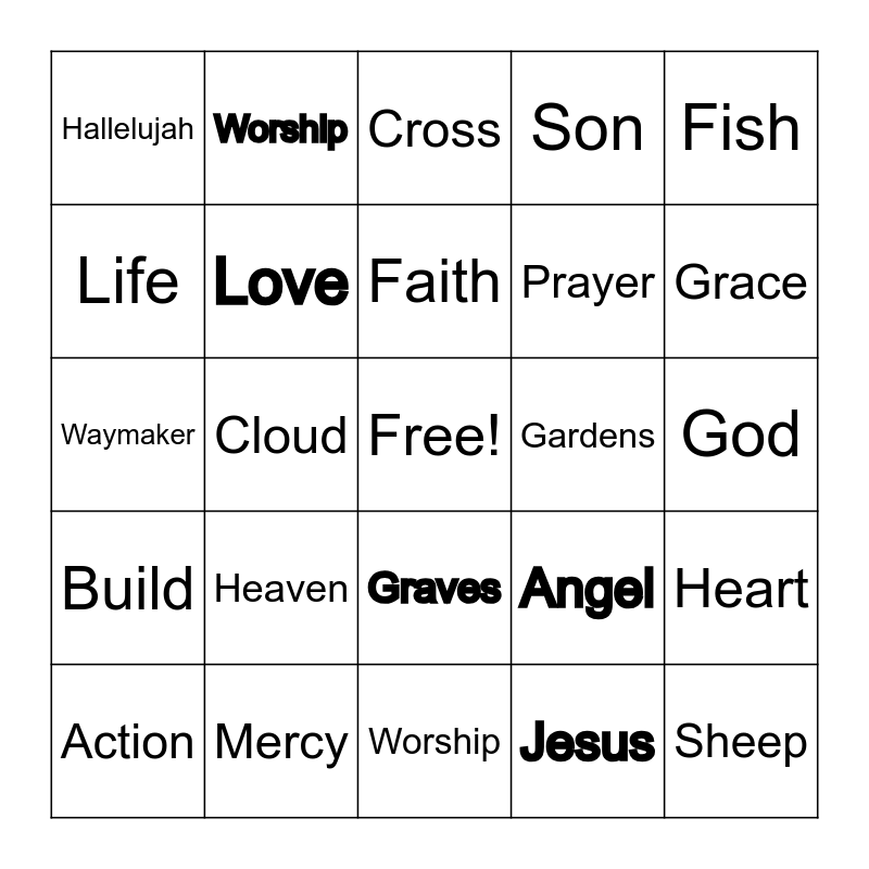 This bingo card has a free space and 29 words: Action, Bless, Cloud, Peter, Hallelujah, Cross, Love, Heaven, Gardens, Mercy, God, Sheep, Worship, Jesus, Grace, Church, Graves, Build, Fish, Waymaker, Angel, Raise, Prayer, Life, Son, Worship, Heart, Faith and Light.