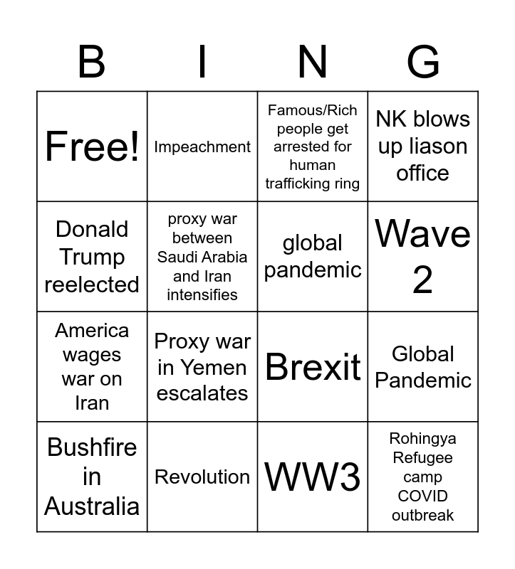 This bingo card has 19 words: America wages war on Iran, Murder Hornets, Famous/Rich people get arrested for human trafficking ring, Global Pandemic, Bushfire in Australia, Impeachment, Recession, NK blows up liason office, Free!, Proxy war in Yemen escalates, Brexit, Wave 2, Donald Trump reelected, Revolution, WW3, Rohingya Refugee camp COVID outbreak, global pandemic, proxy war between Saudi Arabia and Iran intensifies and WW3.