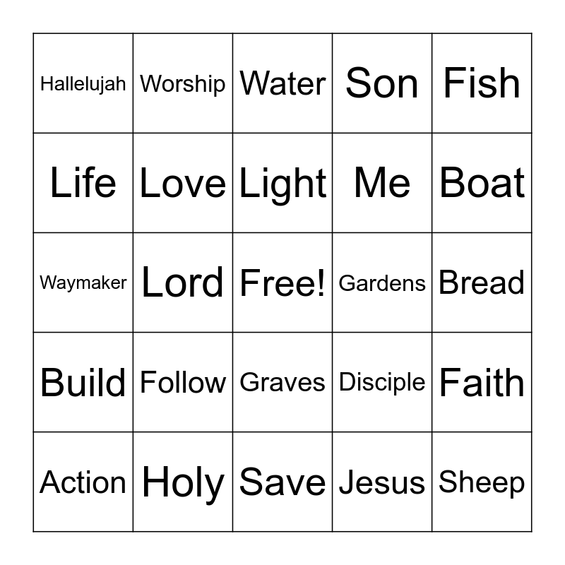 This bingo card has a free space and 29 words: Action, Bless, Lord, Peter, Hallelujah, Water, Love, Follow, Gardens, Holy, Bread, Sheep, Save, Jesus, Boat, Net, Graves, Build, Fish, Waymaker, Disciple, Raise, Me, Life, Son, Worship, Faith, Light and Spirit.