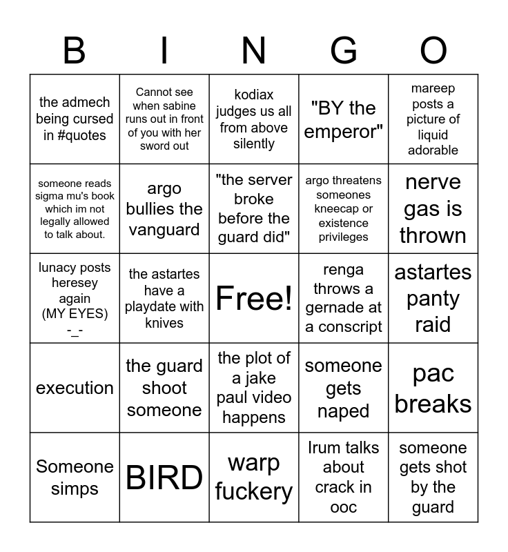 This bingo card has a free space and 29 words: Someone simps, baker takes someone to the forever box, the astartes have a playdate with knives, the sisters beat someone, the admech being cursed in #quotes, kodiax judges us all from above silently, argo bullies the vanguard, the guard shoot someone, renga throws a gernade at a conscript, BIRD, astartes panty raid, someone gets shot by the guard, warp fuckery, Irum talks about crack in ooc, nerve gas is thrown, Vanguard gives someone cancer, the plot of a jake paul video happens, execution, mareep posts a picture of liquid adorable, lunacy posts heresey again (MY EYES) -_-, someone gets naped, anthemius gets diabetes, argo threatens someones kneecap or existence privileges, someone reads sigma mu's book which im not legally allowed to talk about., "BY the emperor", Cannot see when sabine runs out in front of you with her sword out, pac breaks, "the server broke before the guard did" and "servius gets blamed for something".