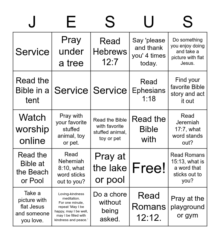 This bingo card has 25 words: Read Nehemiah 8:10, what word sticks out to you?, Do a chore without being asked., Service, Take a picture with flat Jesus and someone you love., Do something you enjoy doing and take a picture with flat Jesus., Service, Read the Bible in a tent, Pray under a tree, Read the Bible with, Pray at the lake or pool, Read Ephesians 1:18, Watch worship online, Free!, Read Romans 15:13, what is a word that sticks out to you?, Service, Pray at the playground or gym, Read Jeremiah 17:7, what word stands out?, Read Hebrews 12:7, Find your favorite Bible story and act it out, Pray with your favorite stuffed animal, toy or pet., Read the Bible with favorite stuffed animal, toy or pet, Loving-kindness meditation. For one minute, repeat ‘May I be happy, may I be well, may I be filled with kindness and peace.’, Read the Bible at the Beach or Pool, Say 'please and thank you' 4 times today. and Read Romans 12:12..