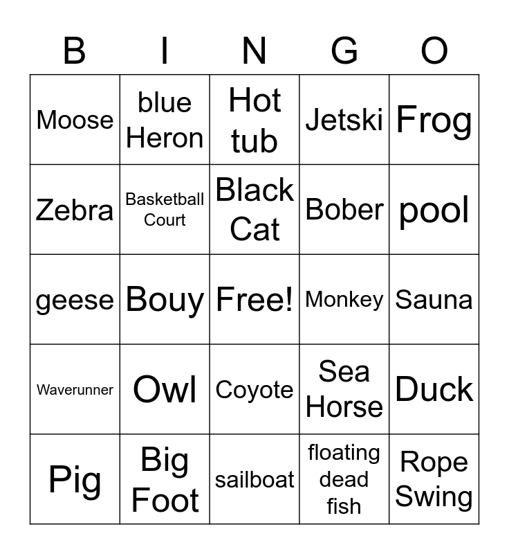 This bingo card has a free space and 24 words: Owl, Big Foot, Black Cat, Pig, Frog, Moose, Zebra, blue Heron, Monkey, Coyote, Bober, geese, Sea Horse, Duck, Basketball Court, floating dead fish, Sauna, Hot tub, pool, Bouy, Rope Swing, Waverunner, Jetski and sailboat.
