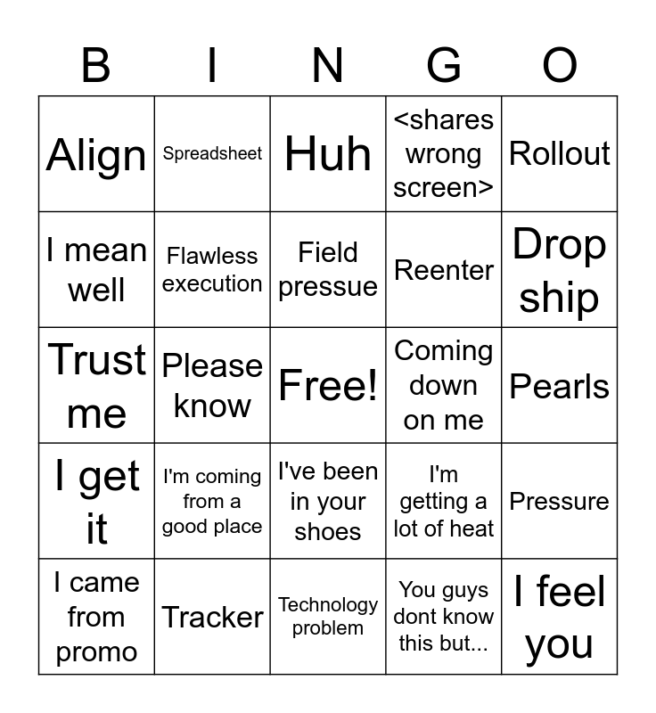 This bingo card has a free space and 24 words: I'm coming from a good place, Tracker, Field pressue, I came from promo, Rollout, Align, I mean well, Spreadsheet, Coming down on me, I've been in your shoes, Reenter, Trust me, I'm getting a lot of heat, Pressure, Flawless execution, You guys dont know this but..., Pearls, Huh, Drop ship, Please know, I feel you, I get it, <shares wrong screen> and Technology problem.