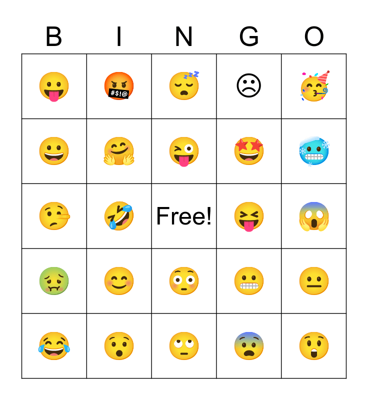 This bingo card has a free space and 29 words: 😂, 😁, 🤣, 😕, 😛, 😴, 🤗, 😊, 😝, 😯, 😱, 😲, 🙄, 😨, 🥶, 😰, 😳, 🤢, 🥳, 🤥, 😬, 😉, 🤩, 😀, ☹, 🤬, 😐, 😜 and 😍.