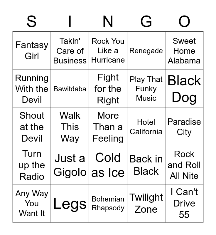 This bingo card has 25 words: Just a Gigolo, Bohemian Rhapsody, Fight for the Right, Any Way You Want It, Sweet Home Alabama, Fantasy Girl, Running With the Devil, Takin' Care of Business, Hotel California, Cold as Ice, Play That Funky Music, Shout at the Devil, Back in Black, Rock and Roll All Nite, Bawitdaba, I Can't Drive 55, Paradise City, Rock You Like a Hurricane, Black Dog, Walk This Way, More Than a Feeling, Legs, Turn up the Radio, Renegade and Twilight Zone.