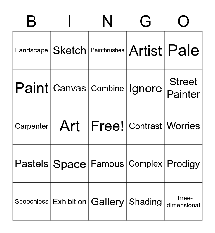 This bingo card has a free space and 35 words: Texture, Shapes, Perspective, Canvas, Famous, Artist, Paint, Washable, Combine, Frame, Carpenter, Pale, String, Sculptor, Landscape, Contrast, Shading, Art, Pastels, Three-dimensional, Complex, Speechless, Prodigy, Exhibition, Paintbrushes, Street Painter, Stained, Sculptor, Ignore, Worries, Brilliant, Gallery, Space, Sketch and Fascination.