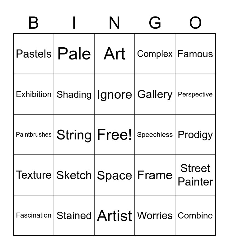 This bingo card has a free space and 35 words: Washable, Three-dimensional, Carpenter, Shading, Space, Complex, Exhibition, Brilliant, Ignore, Paint, Paintbrushes, Famous, Canvas, Sculptor, Pastels, Speechless, Worries, String, Texture, Combine, Frame, Fascination, Street Painter, Stained, Art, Perspective, Sculptor, Contrast, Gallery, Prodigy, Landscape, Artist, Sketch, Pale and Shapes.