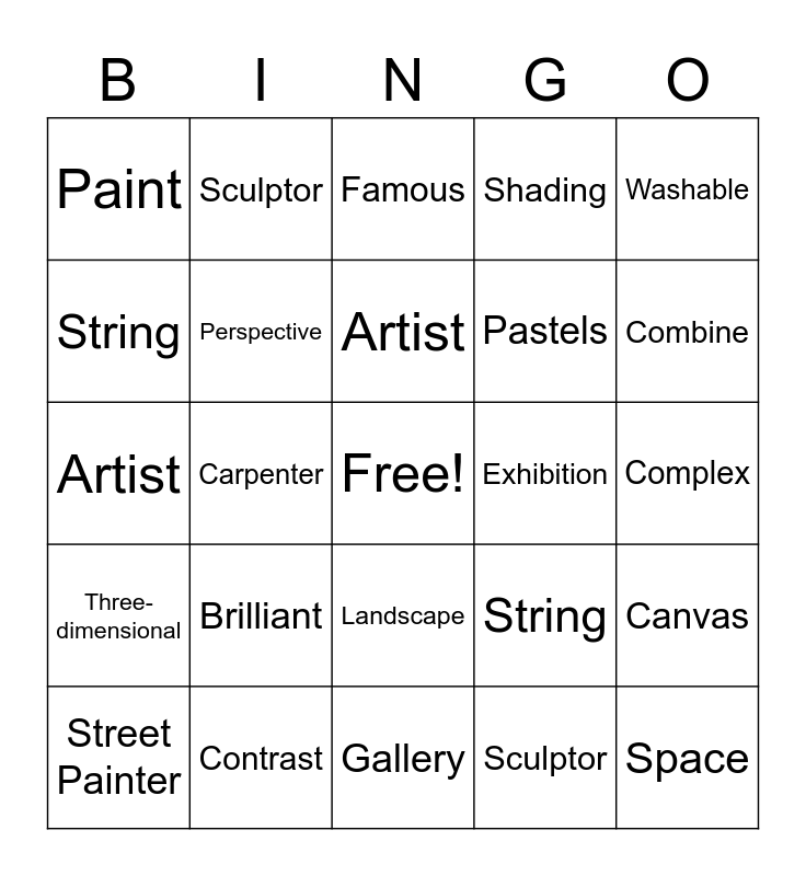 This bingo card has a free space and 40 words: Landscape, Artist, Art, Perspective, Contrast, Landscape, Artist, Sketch, Washable, Three-dimensional, Carpenter, Shading, Space, Complex, Exhibition, Brilliant, Ignore, Paint, Paintbrushes, Famous, Canvas, Sculptor, Pastels, String, Texture, Frame, Pastels, Speechless, Worries, Pale, Fascination, Street Painter, Stained, String, Combine, Gallery, Prodigy, Contrast, Sculptor and Shapes.