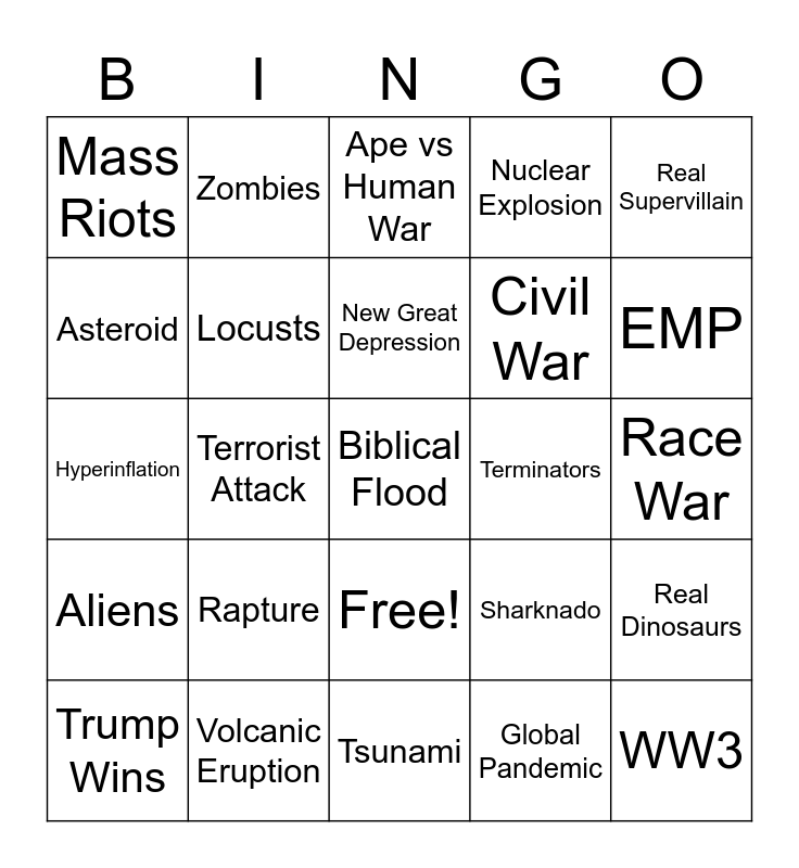 This bingo card has 26 words: Free!, Global Pandemic, New Great Depression, Volcanic Eruption, Real Supervillain, Mass Riots, Asteroid, Zombies, Race War, Sharknado, Civil War, Hyperinflation, Real Dinosaurs, Trump Wins, Terrorist Attack, Airplane Crash, Nuclear Explosion, Aliens, Ape vs Human War, Biblical Flood, EMP, Tsunami, Terminators, Rapture, Locusts and WW3.