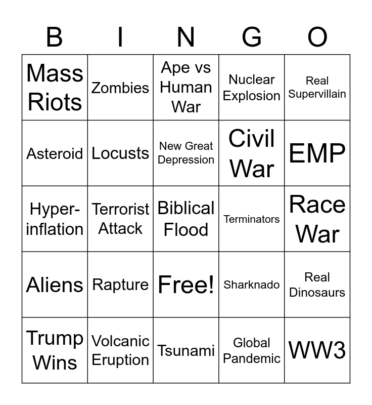 This bingo card has 26 words: Free!, Global Pandemic, New Great Depression, Volcanic Eruption, Real Supervillain, Mass Riots, Asteroid, Zombies, Race War, Sharknado, Civil War, Hyper- inflation, Real Dinosaurs, Trump Wins, Terrorist Attack, Airplane Crash, Nuclear Explosion, Aliens, Ape vs Human War, Biblical Flood, EMP, Tsunami, Terminators, Rapture, Locusts and WW3.