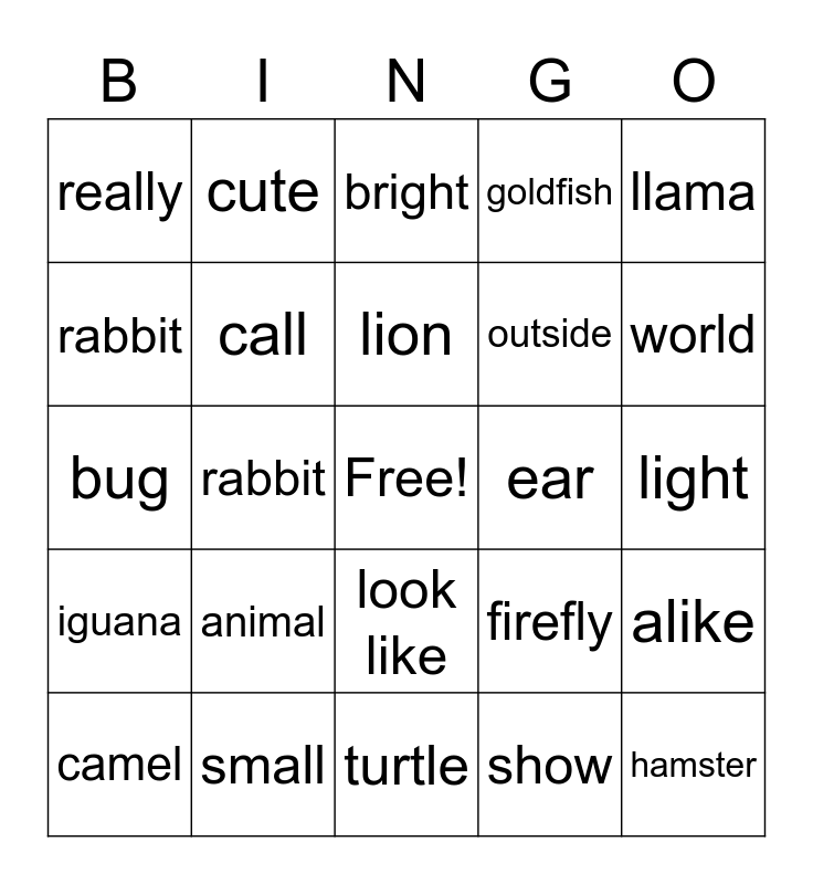 This bingo card has a free space and 24 words: animal, small, lion, camel, llama, really, rabbit, cute, ear, look like, outside, bug, firefly, alike, call, show, light, bright, world, rabbit, hamster, iguana, goldfish and turtle.
