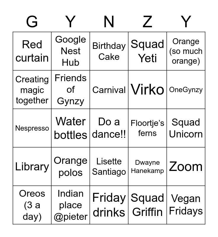 This bingo card has a free space and 161 words: Alfred Sengers, Arie de Bonth, Backlog, Bart van Hooft, Be bold, stay gold, Be humble but proud, Bossche bol, Carnaval, Chantal Westenberg, Chris Vossen, Creating magic together, Daniel Genis, Birthday Cake, Den Bosch, Dwayne Hanekamp, Erik Goossens, Photo of the day, Funnel Feeder, Gisny, Gynzification, Gynzy Jukebox, Gynzy Kids, Gynzyfied, Happy Teachers, Happy Kids, Hard work, good times, Hester Buesseler, Red curtain, icebox, Inge Kwanten, Intercom, ISTE, Jeroen Bell, Johan van der Laak, Leo (officevibe), Magic together, Martijn Lenderink, Matthijs Bloemendal, Morning routine, MoSCoW, Mr & Ms Mold, OneGynzy, Pipedrive, Readspeaker, Rekenrek, Scrum of scrums, Sjors Stassen, Slackbot, Interview at Hooters, Squad Bald Eagle, Squad Blackbeard, Squad Bumblebee, Squad Deans, Squad Direwolf, Squad Griffin, Squad Hydra, Squad Mammoth, Squad Peacock, Squad Pegasus, Squad Saber, Squad T-rex, Squad Unicorn, Squad Yeti, Squad Narwhal, Unicorn manager, Valetta, Virko, Wouter van den Borne, Gynzy, Zenisha, Floortje’s ferns, Pizza Wednesday, Isolation chamber, Productboard, Library, New York, Michael Wickham, Lisette Santiago, Vivian Chang, Pieter Smits, Nick SanGiacomo, Kurt Vandebroek, Ralf Schimmel, Rutger Peters, Jean-Pierre Deckers, Tyler, Anthony, Authors, PD sessions, Gynzy Expert, Pieter’s bike, M&M’s, Newsletter, Carnival, Hedwig, Orange (so much orange), Gold, Freight elevators, Bagel place, “Spanish” place, Sandwich place, Thai Holic, Indian place @pieter, Oreos (3 a day), Nespresso, Orange polos, Wegmans, Sherry- the pointing teacher, Post-it notes on the window, Hanging plants, Fear of dead plants, Pepernoten, Sinterklaas costume, Dance Monkey song, Here Comes the Sun, Lime and Pamplemousse La Croix, Miami Beach, TapRm, Brooklyn Navy Yards, Friday drinks, Rooftop crashing, Ferry, Building 77, 13th Floor, Unit 2, Metrotech, BNY shuttle, Rip’s Malt shop, Dear Irving, Darleen, Drop, Hagelslag, Falling clocks, Google Nest Hub, Atlassian, Jira, Notion, Aircall, Zendesk, Good Busy, Friends of Gynzy, Zoom, Loom, Eventbrite, Vimeo, Water bottles, Silver, Retrospective, Stand Up, Vegan Fridays, Il Porto, Rugola and Prosciutto pizza, Fastboot, Leerlijnen, Unicorn Manager, Conrad, Learning sessions, Mand, Activation, Google Data Studio, us-squad-us, CAC, SaSS and thoughts like a leaf on a stream.