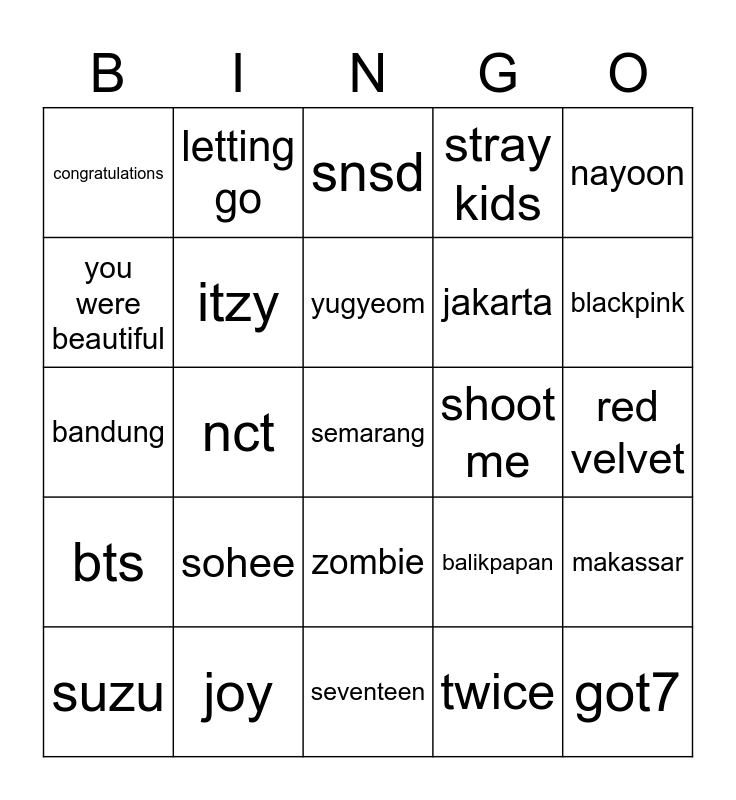 This bingo card has a free space and 24 words: sohee, joy, yugyeom, suzu, nayoon, congratulations, you were beautiful, letting go, shoot me, zombie, jakarta, bandung, balikpapan, makassar, itzy, twice, red velvet, snsd, blackpink, nct, got7, bts, stray kids and seventeen.