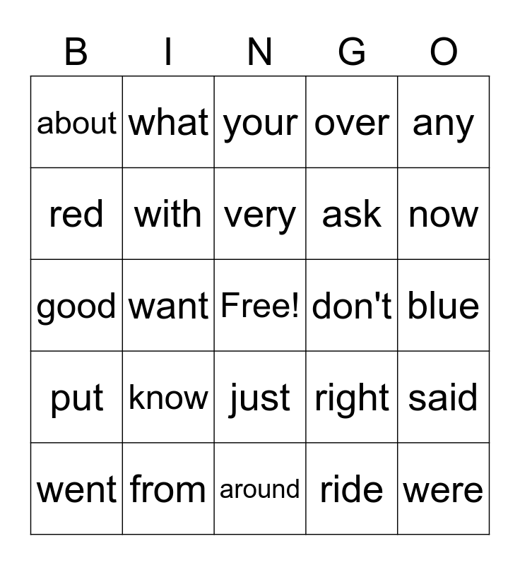 This bingo card has a free space and 24 words: know, from, very, went, any, about, red, what, don't, just, ask, good, right, said, with, ride, blue, your, now, want, were, put, over and around.