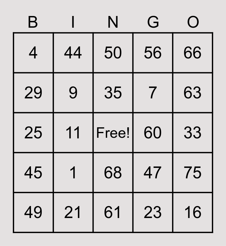 This bingo card has a free space and 24 words: 1, 21, 35, 49, 66, 4, 29, 44, 60, 68, 7, 25, 47, 75, 9, 23, 33, 50, 63, 11, 16, 45, 56 and 61.