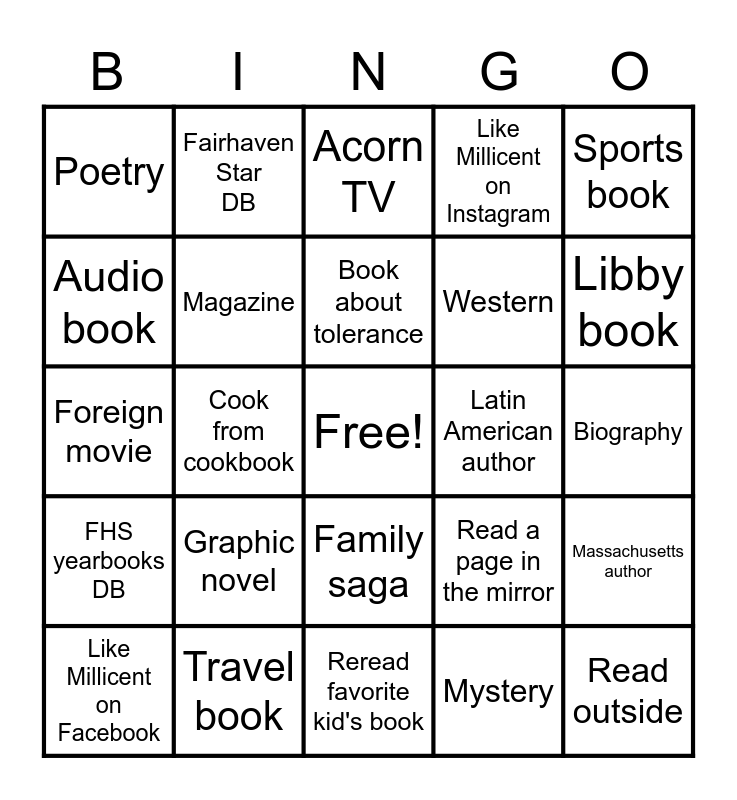 This bingo card has a free space and 29 words: Like Millicent on Facebook, Hoopla movie, Cook from cookbook, Read in PJ's, Poetry, Acorn TV, Magazine, Graphic novel, Latin American author, Travel book, Biography, Read outside, Reread favorite kid's book, Mystery, Libby book, Asian author, Family saga, FHS yearbooks DB, Sports book, Foreign movie, Read a page in the mirror, Visit BookPage website, Western, Audio book, Like Millicent on Instagram, Fairhaven Star DB, Massachusetts author, Book about tolerance and Science Fiction.