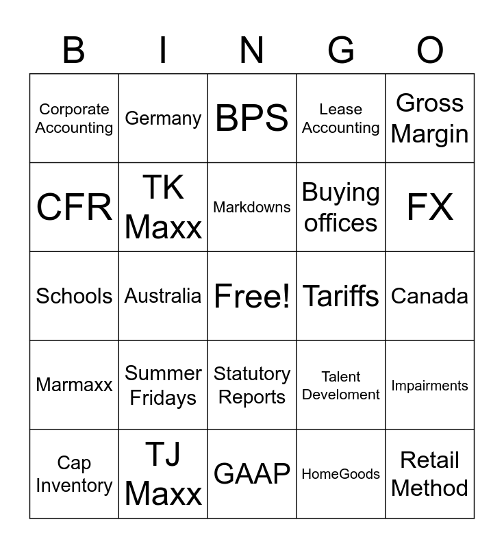 This bingo card has a free space and 59 words: The TJX Companies, TJ Maxx, Marshalls, Marmaxx, HomeGoods, Homesense, TK Maxx, Winners, Buying offices, ASC 842, Lease Accounting, 10-Q/10-K, CFR, Global Accounting, Divisional Accounting, Corporate Accounting, Retail Method, Gross Margin, Net Sales, Markdowns, Tariffs, BPS, Cap Inventory, Impairments, HFM, Embedded Leases, Derivatives, Hedging, FX, Journal Entries, Europe, UK, Ireland, Poland, Germany, Austria, Netherlands, Australia, Familia, Schools, Connectivity Committee, Summer Fridays, Canada, US, Distribution Centers, Digital, Sierra, Ecomm, Statutory Reports, GAAP, XBRL, SOX, Champion Culture, Meet & Greets, Synchrony, Talent Develoment, Controls, Townhall and Associates.